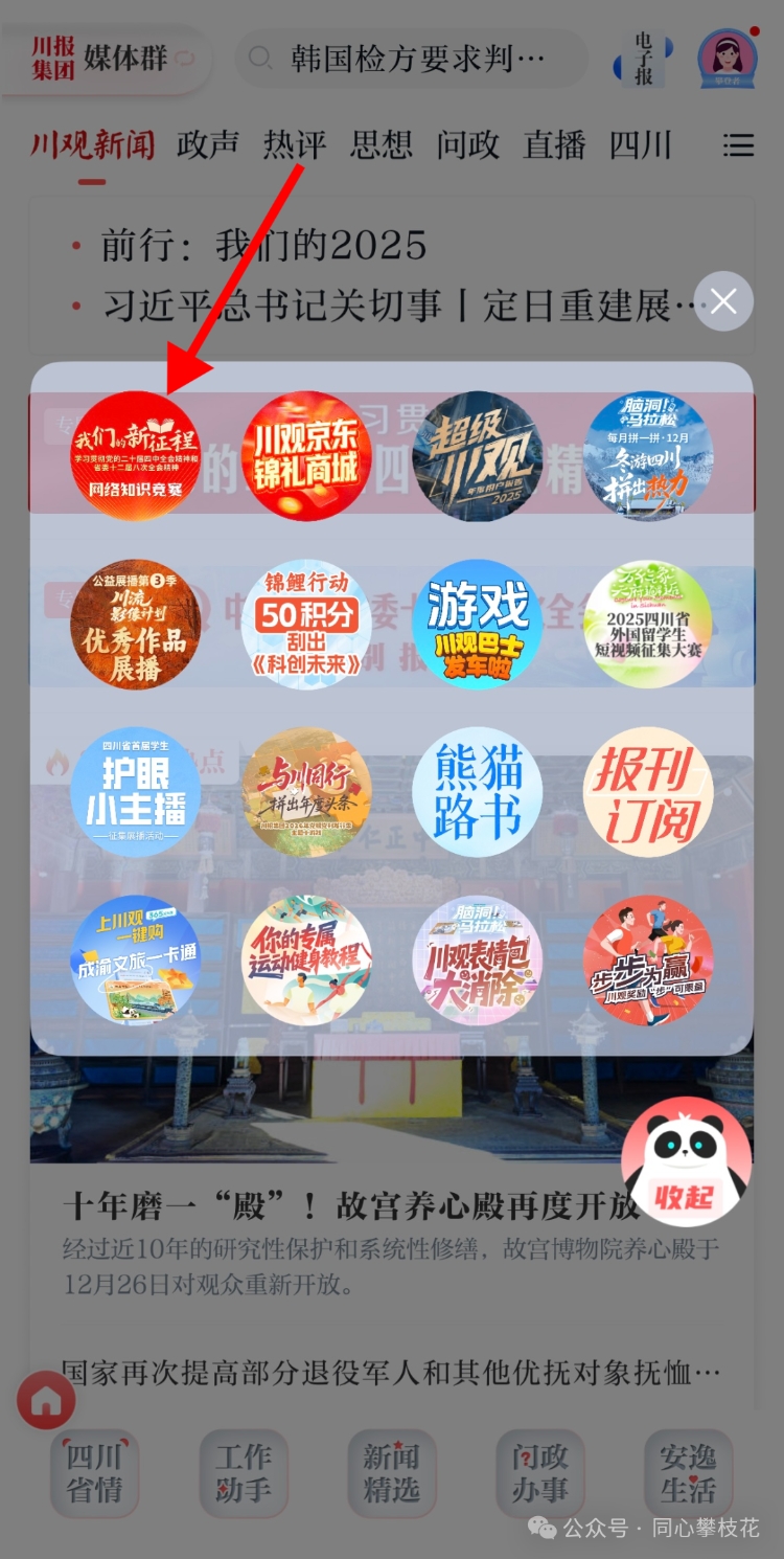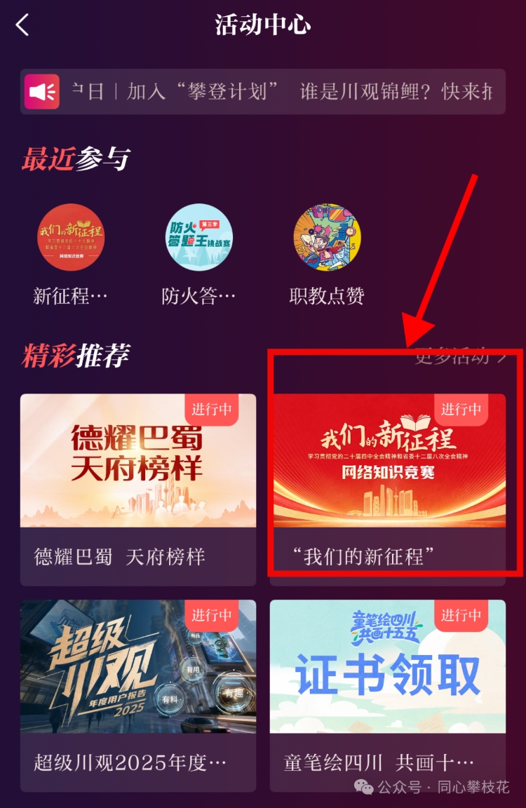 1.在川观新闻首页,点击右方悬浮球,找到《“我们的新征程”—学习贯彻党的二十届四中全会精神和省委十二届八次全会精神网络知识竞赛》活动图片,点击参与活动即可参与答题;
