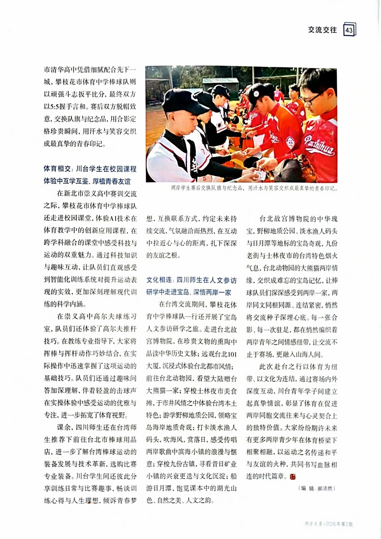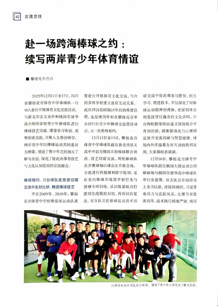 2025年12月11日至17日,四川省攀枝花市体育中学棒球队一行16人赴台开展体育文化交流活动,与新北市崇义高中和桃园市清华高中两所学校青少年棒球队进行棒球技艺切磋、课堂学习体验、观摩座谈交流,开展人文参访研学。两岸青少年以棒球运动共同爱好为桥梁,增进了青少年之间相互了解与友谊,深化了彼此在体育技艺与文化认知层面的交流融合。
